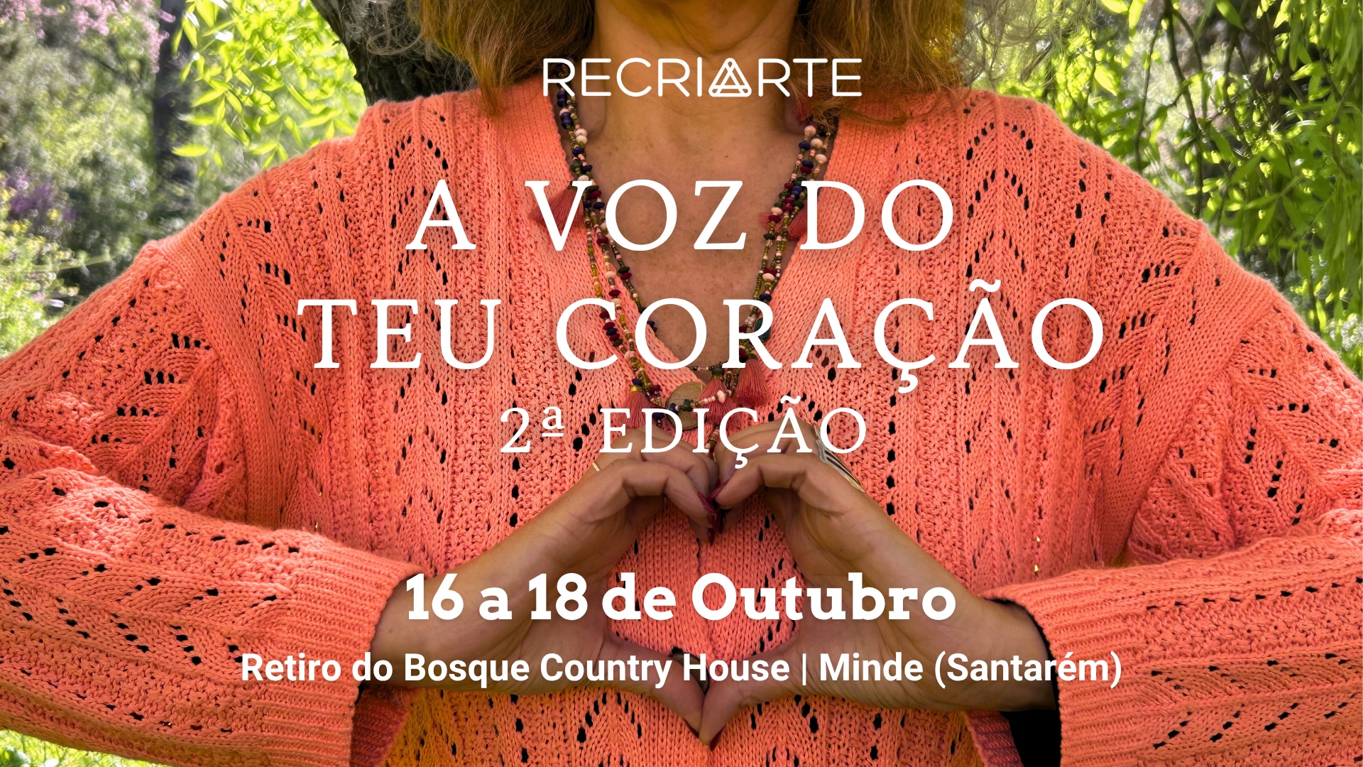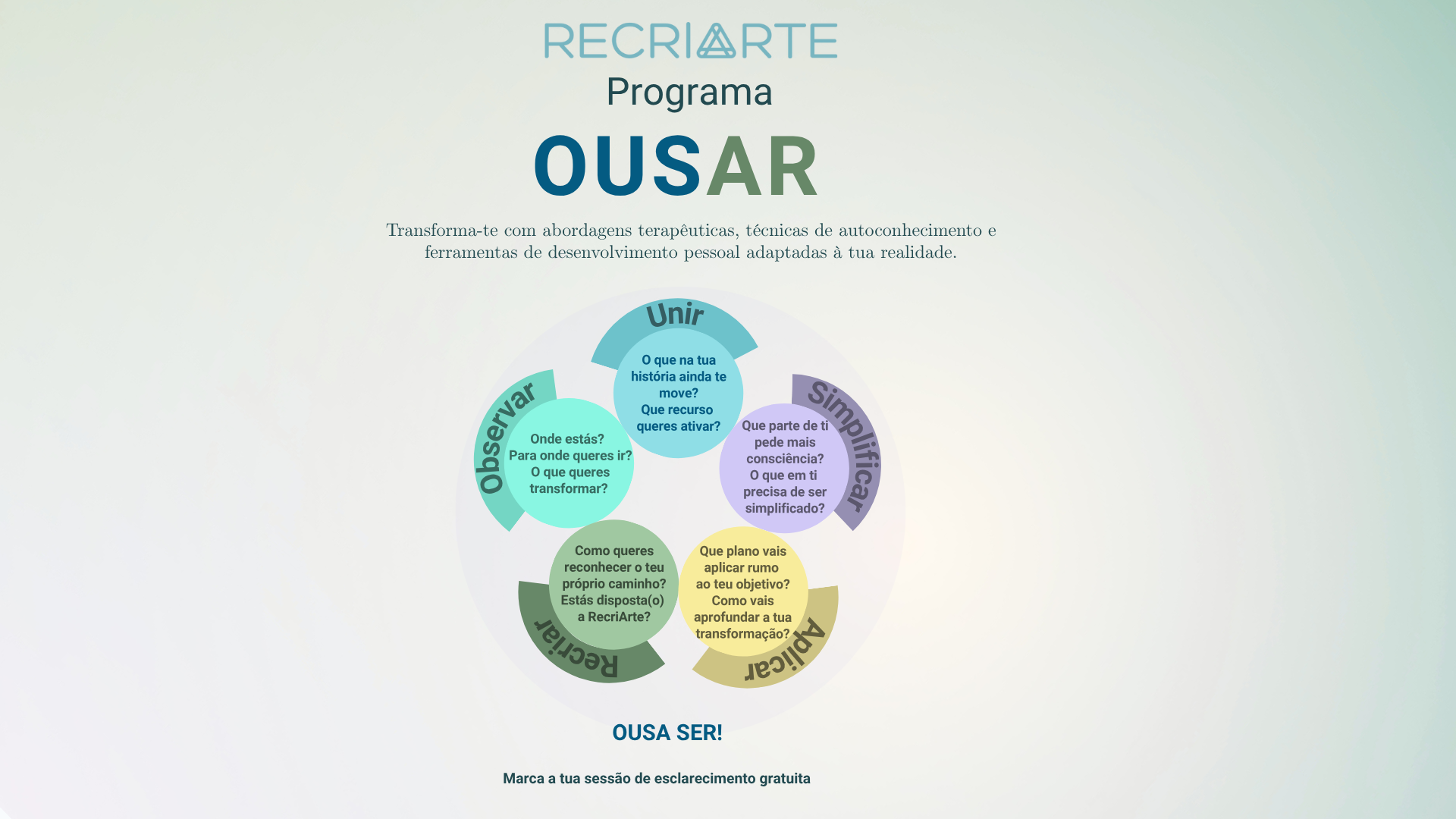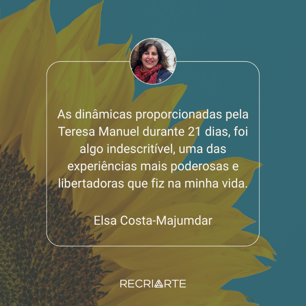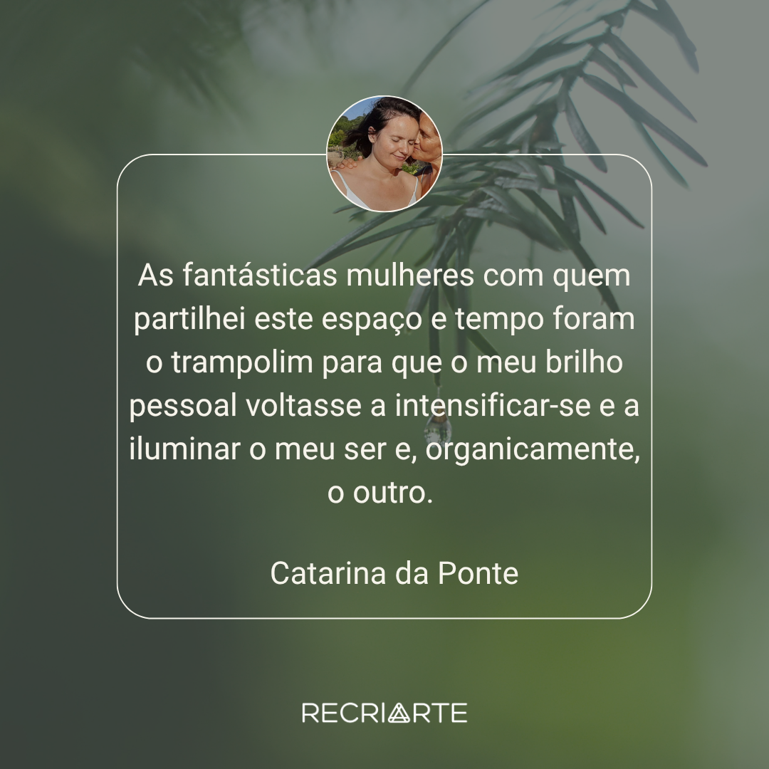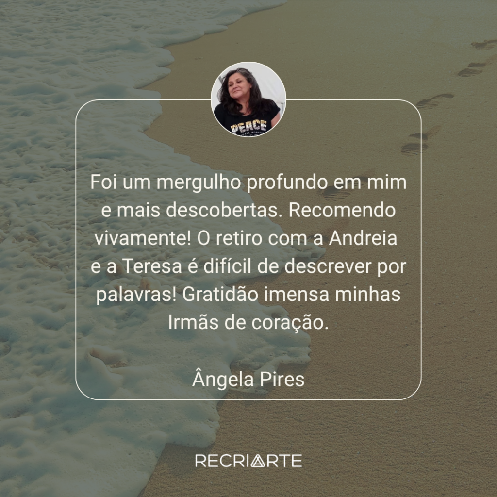 A RecriArte proporciona-te um conjunto de Serviços e Eventos , como Retiros Imersivos, um Programa Exclusivo de Desenvolvimento Pessoal – OUSAR – e práticas de Autocuidado e Bem-Estar com a RecriArte Em Movimento, para trazer mais energia, equilíbrio e harmonia à tua vida.